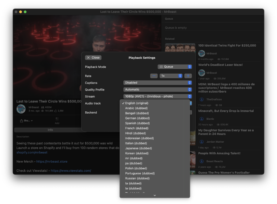 At the time of this PR, one limitation remained: when Invidious Companion was enabled, different audio tracks could resolve to the same itag URL, so switching tracks did not always change the final language.